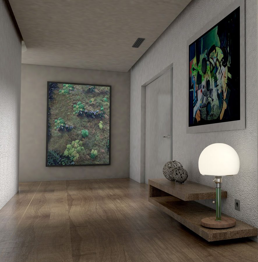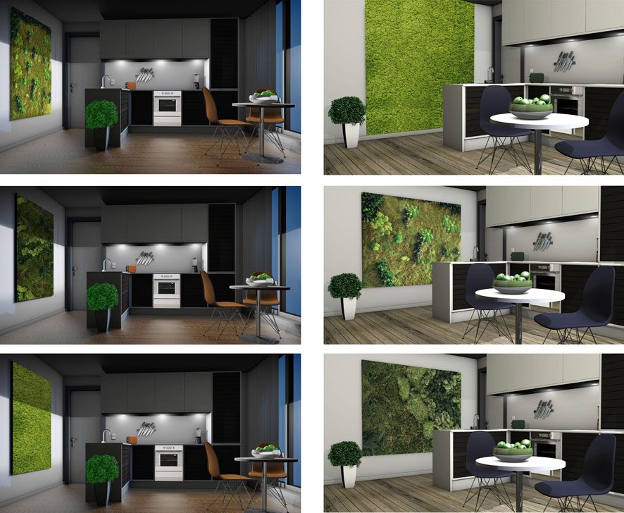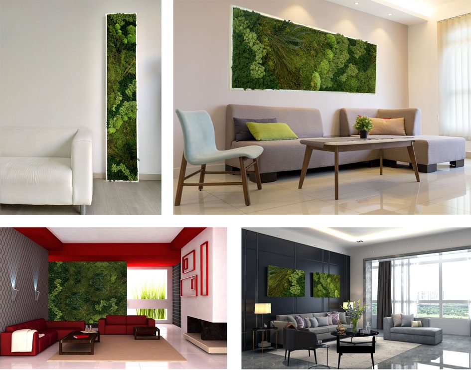 Los cuadros de musgo dan una sensación similar a la de un espejo, no acaban allí donde llega la vista, sino que aportan profundidad, luz y amplitud a un espacio pequeño.