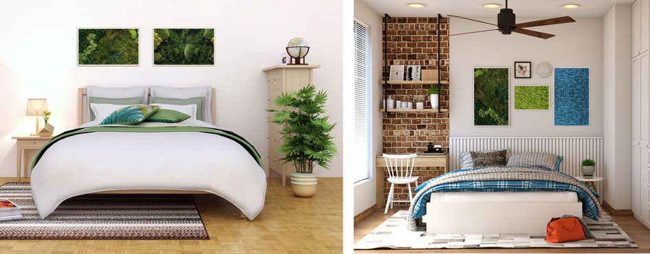¿Y si en vez de ser un cuadro fueran dos o tres? Una combinación de dos o tres diseños diferentes de cuadros de musgo revalorizará nuestra habitación a la vez que la convertirá en una estancia acogedora, apacible y serena.