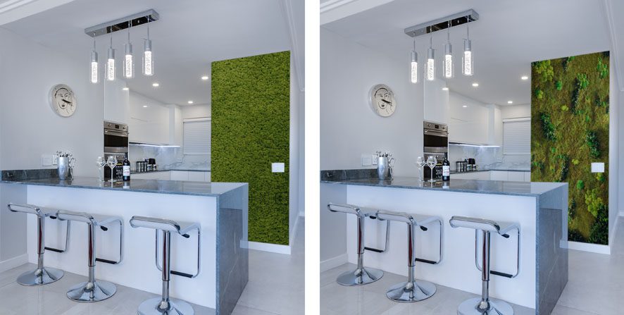 Los jardines verticales y los cuadros de musgo son tan versátiles que se pueden adaptar a cualquier diseño de cocina.